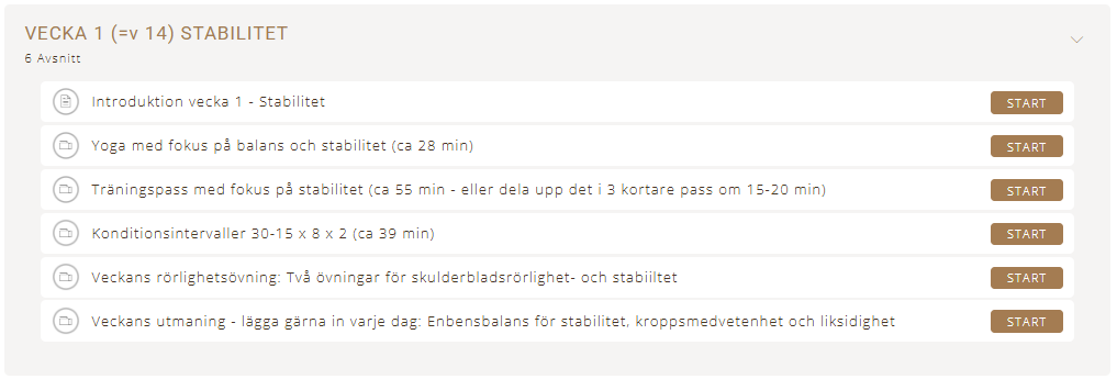 Veckoträningsuppläggen startar från måndag den 30 mars. Du får då under 7 veckor färdiga veckoupplägg med inspelade träningspass, yogaklasser och löp-/konditionspass för så komplett, allsidig och varierad träning som möjligt. Upplägget är sådant att vi successivt bygger på och vidareutvecklar övningarna vecka för vecka för att få progression i träningen.